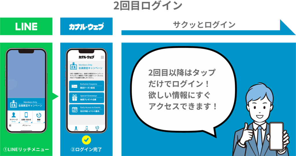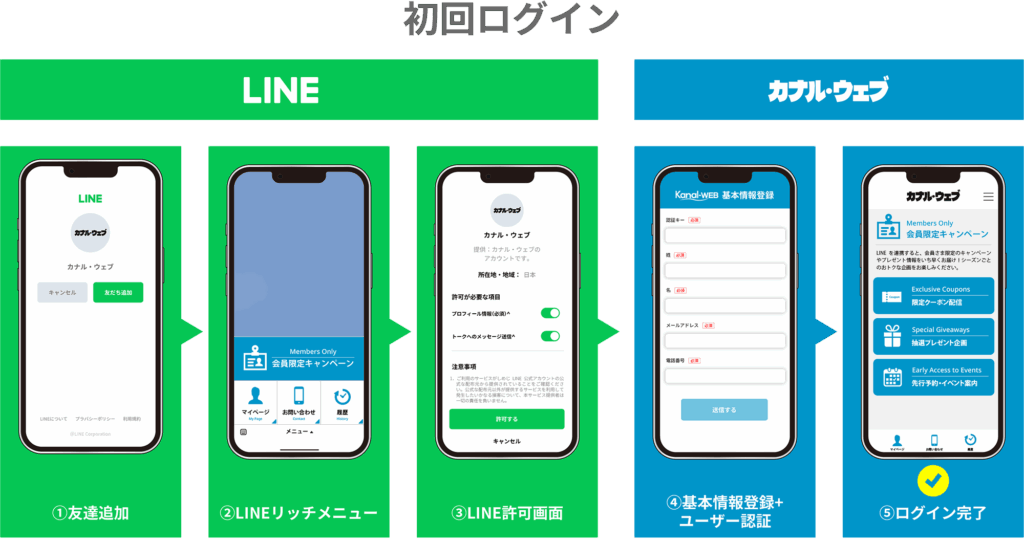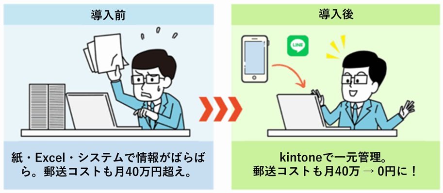 Home kintone × LINEで業務改善|顧客管理と情報共有を簡単に kintone × LINEで業務改善|顧客管理と情報共有を簡単に kintone × LINEで 顧客管理の非効率をゼロに。 普段使いのLINE連携とできるポータルサイト。郵送・電話・メール業務の無駄を削減し、成果を出す仕組みを整備できます。(事例:工数 120時間 → 25時間 に削減) お問合せ・資料請求 こんな非効率に困っていませんか? 転記作業に追われる 情報バラバラ・二重管理 誰のデータか分からない 紙やメール、Excelで届いた情報を手入力しており、時間も手間も無駄になっている。 Excelや他システムなど複数の場所で情報を管理しており、顧客データと紐づかない状態になっている。 問い合わせや注文がどの顧客に対応するものかすぐに判別できず、確認作業に時間がかかる。 その課題、kintone × LINE連携で解決できます。 Webフォームで直接データ登録 全データを集約ビューワーで共有 マイページで顧客データと紐づけ フォームで入力した情報は自動でkintoneに登録されるため、紙やメールで届いた情報の転記作業が不要になります。 また、データはすべてkintoneに集約されます。さらに、ビューワー機能を活用することで、顧客にデータを共有することもできます。 さらに、顧客マスタと連携したデータ管理が可能です。問い合わせや注文情報は、顧客マスタと紐づいた状態で登録されます。 サービス全体像 kintoneにプラグインとアプリテンプレートをインストールして、すぐに使えます。今あるデータもそのまま活用できます。(※別途、LINE公式アカウントの契約が必要です) LINEメッセージ送信も可能です。 特徴 ① LINEログイン認証 いつものLINEで、そのまま利用開始。メールアドレスやパスワードの入力は不要。リッチメニューからワンタップで、自分の情報にすぐアクセスできます。 ②オリジナルデザイン 自社ロゴやブランドカラーに合わせたオリジナルデザインで構築できます。LINE連携のマイページやWebフォームも、JavaScript・CSS・HTMLによる柔軟なカスタマイズが可能です。自社サービスとして自然に提供できるため、顧客体験の向上やブランド価値の強化にもつながります。顧客管理や情報共有の仕組みを整え、企業のDX推進を強力にサポートします。 ③利用者数が増えても料金はそのまま ユーザー数が増えても追加料金が発生しない定額制プランでご利用いただけます。利用者の増加によるコスト負担がなく、安心してビジネスをスケールさせることができます。顧客管理や申請手続き、情報共有をLINEで効率化することで、業務時間の削減と郵送・電話・メール対応の削減を両立できます。業務改善やコスト削減、顧客満足度向上を実現するkintone連携サービスです。 お問合せ・資料請求 導入事例 ニコニコ観光株式会社様 | 1ヶ月の作業工数を約80%削減 ・業種:旅客自動車運送業・用途:勤怠管理・案件管理・効果:担当者の作業時間 月120時間 → 25時間へ削減(▲95時間)kintone hiveと kintone AWARDにも登壇https://ascii.jp/elem/000/004/295/4295002/2/事例詳細はこちらhttps://kanal-web.biz/insights/casestudy-nikonikokankou/ 社労士法人様:書類Web共有化で郵送費0円に ・業種:社労士・用途:会員向け申請手続き・情報共有・効果:郵送費 月40万円 → 自社負担0円(※紙での郵送を希望する場合は、手数料をいただく仕組みに変更)【Before】書類をすべて郵送していた為、到着確認や再発行対応など非効率な業務が発生していた。【After】LINE通知からマイページにアクセスするだけで書類を即時確認でき、会員側も過去資料をいつでもダウンロード可能に。これにより、郵送や再発行対応は大幅に削減され、業務負担も軽減。